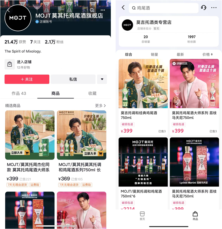 但新零售商業(yè)評(píng)論11月23日查詢發(fā)現(xiàn),在抖音平臺(tái),“MOJT莫其托雞尾酒旗艦店”售賣的是此前推出的“大師系列”,“貴州味道”系列雞尾酒不見蹤影,“MOJT莫其托周同學(xué)酒類專賣店”則顯示“0件好物”。