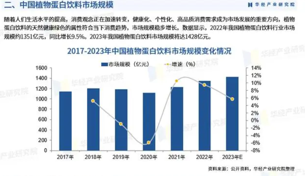 從市場角度來說,“植物基”在中國市場,乃至全球市場,仍有廣闊的發(fā)展空間。據(jù)華經(jīng)產(chǎn)業(yè)研究院發(fā)布的《2023-2028年中國植物蛋白飲料行業(yè)發(fā)展前景預(yù)測及投資戰(zhàn)略規(guī)劃研究報告》顯示,植物蛋白奶在我國有著廣闊的市場前景,未來幾年植物奶行業(yè)仍將保持較高增速,預(yù)計2025年植物奶市場規(guī)模將超1428億元。