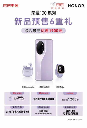 京東五星電器、京東電器線下門店同步12月1日同步現(xiàn)貨開售,即日起,到線下京東電器門店預(yù)約該系列新機可享受6重禮,綜合至高優(yōu)惠1900元,包括送價值299元榮耀Earbuds X6無線耳機,預(yù)約用戶額外禮品加贈,以舊換新至高補貼1200元,支持京東白條分期支付,指定門店可享免費貼膜增值服務(wù),輕松get“楊洋同款”。