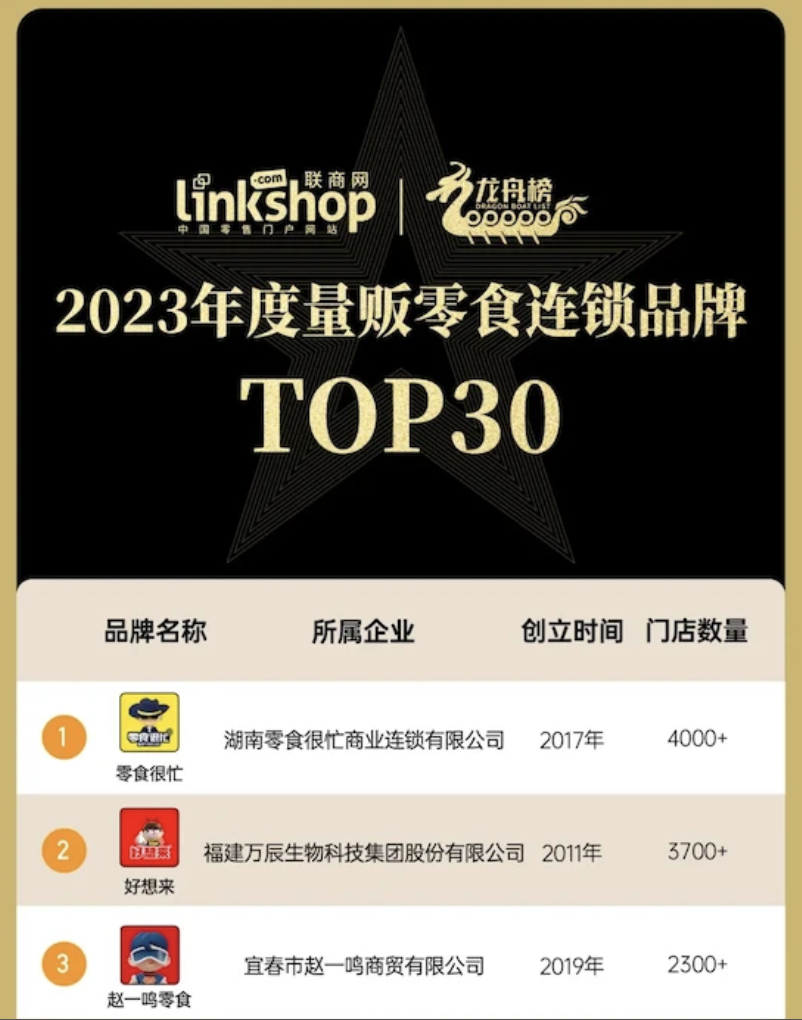 2023年10月,《聯(lián)商網(wǎng)》披露的“2023年度量販零食連鎖品牌TOP30”顯示,趙一鳴零食位居第三,和排名第一的零食很忙之間,僅隔了一個(gè)好想來。