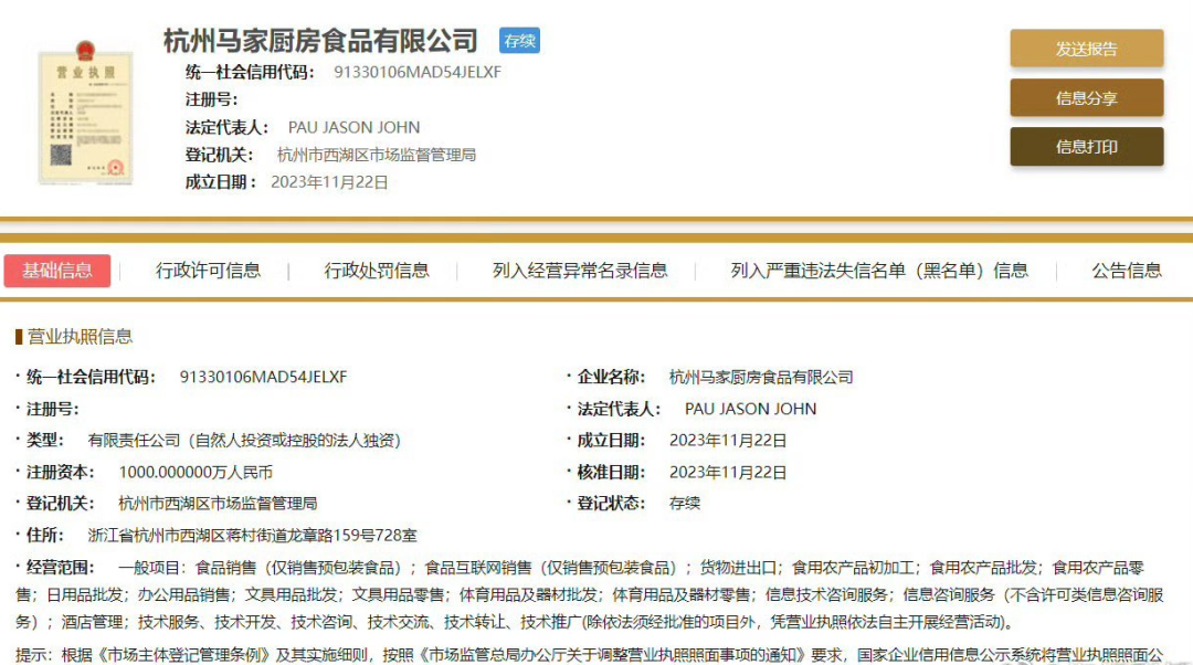 國家企業(yè)信用信息公示系統(tǒng)顯示,11月22日,杭州馬家廚房食品有限公司成立,經(jīng)營范圍含食品銷售(僅銷售預包裝食品)、食品互聯(lián)網(wǎng)銷售(僅銷售預包裝食品)、貨物進出口等等。杭州馬家廚房食品有限公司由杭州大井頭貳拾貳號文化藝術有限公司全資持股,馬云持有后者99.9%的股份。