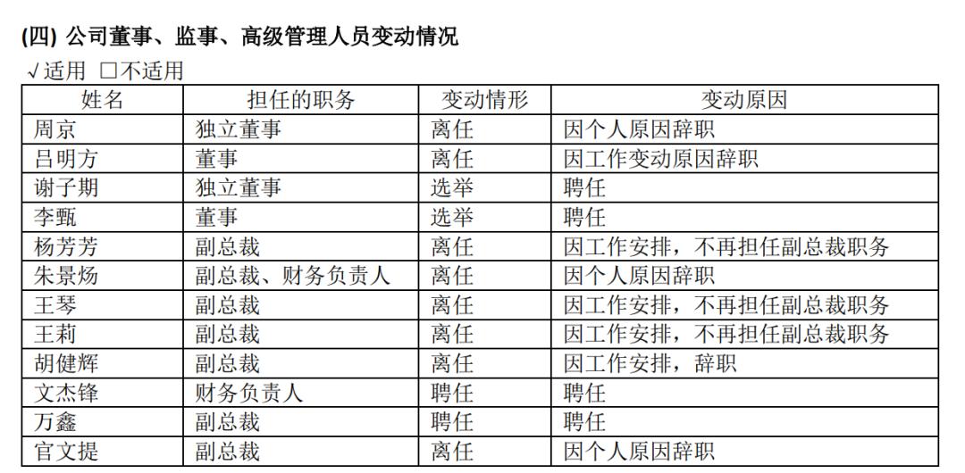 2023年3月,財(cái)務(wù)中心總監(jiān)兼財(cái)務(wù)負(fù)責(zé)人文杰鋒任期尚不滿一年,因個(gè)人原因辭職。6月,公司副總裁王坤因個(gè)人身體原因辭職,任期不滿三年。
