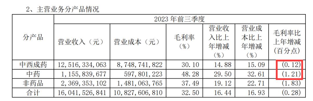 另一方面,老百姓中西成藥(指成分中既有中藥提取、又有明確的化學(xué)制劑的復(fù)方制劑)收入占比較高,2023年前三季度占比達(dá)到78%,而中西成藥業(yè)務(wù)毛利率在公司所有業(yè)務(wù)中最低,因此對公司毛利率有一定的拉低。