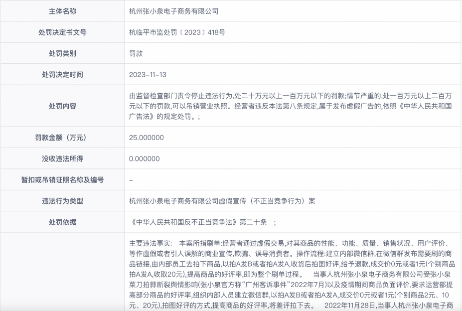 近日,信用中國網(wǎng)站更新了一則行政處罰信息,當事人為張小泉全資子公司杭州張小泉電子商務(wù)有限公司(以下簡稱“張小泉電子商務(wù)”)。信息顯示,當事人組織內(nèi)部人員建立微信群,以拍A發(fā)B或者拍A發(fā)A,成交價0元或者1元,通過拍圖好評的方式,提高商品的好評率,將差評拉下去。