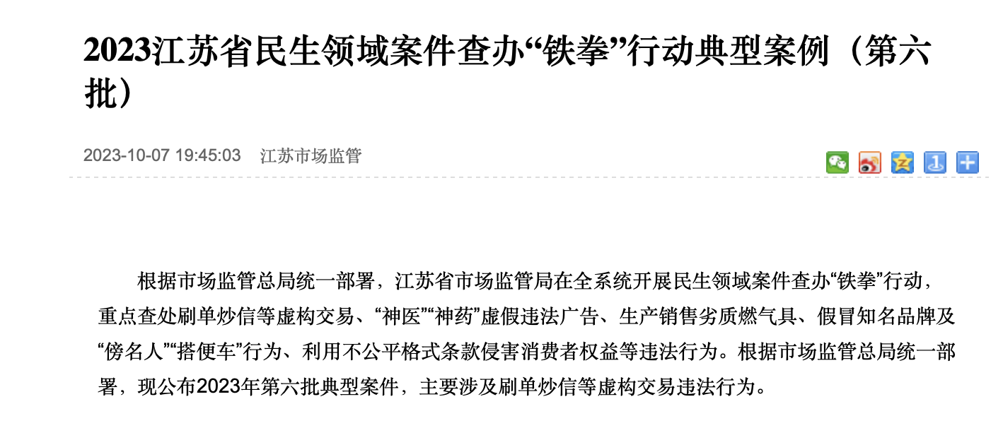 近期,江蘇省市場監(jiān)管局也公布了10起包含刷單炒信等不正當競爭案件,涉案的企業(yè)和商家中,有的組織人員大規(guī)!八巍痹旒,有的委托刷手虛構(gòu)交易記錄。