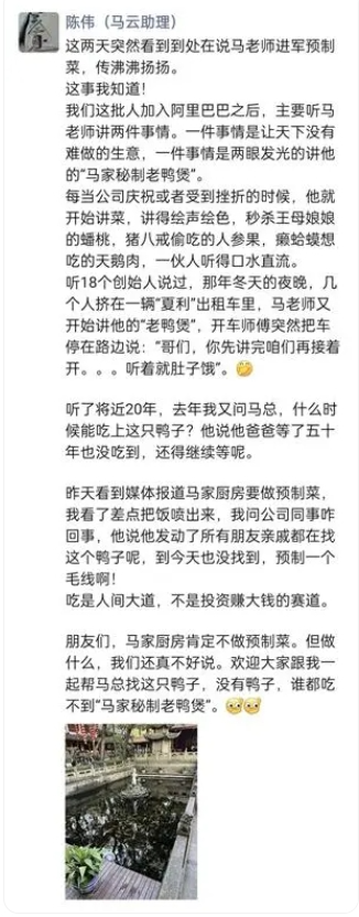 “吃是人間大道,不是投資賺大錢的賽道!睂Υ,馬云前助理陳偉11月25日在朋友圈稱,馬家廚房不做預制菜。