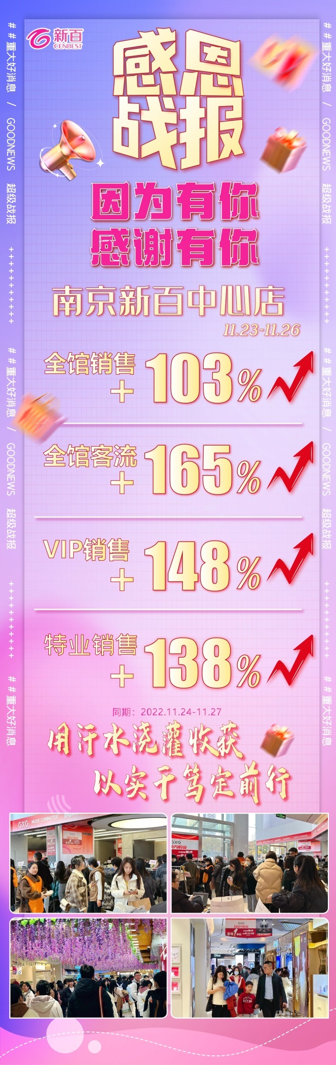 此次感恩節(jié),南京新百中心店業(yè)績?nèi)上升,全館銷售上升103%,客流上升165%,VIP銷售上升148%,特業(yè)銷售上升138%。