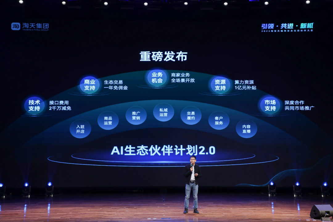 剛剛過去的2023淘寶天貓商家及生態(tài)伙伴大會上,淘天集團還正式發(fā)布了“AI生態(tài)伙伴計劃2.0”,宣布未來將提供1億元計算資源補貼、兩千萬元接口費用減免、0交易傭金等政策,與生態(tài)伙伴一起實現(xiàn)商家經(jīng)營工具的全面智能化升級……