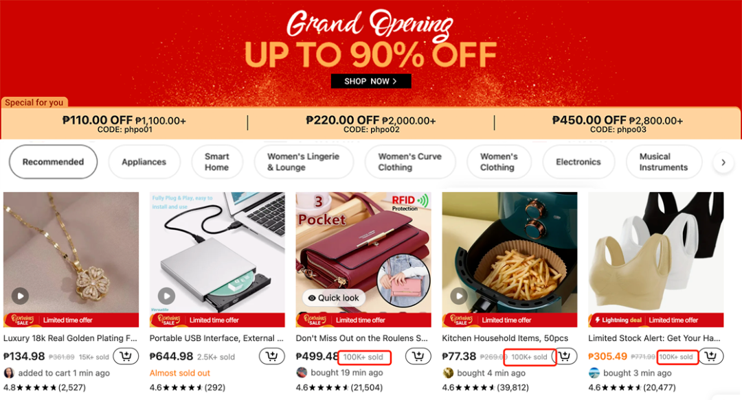 極致的低價往往能迅速打開市場。很快,Temu菲律賓站首頁就出現(xiàn)不少單個產品的銷量突破10萬的商家。