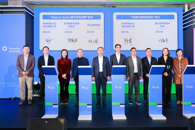 11月28日,在杭州傳化科技城第三屆科創(chuàng)生態(tài)大會上,環(huán)球健康與教育基金會、浙江省科技館與杭州科睿文化科技有限公司就「光環(huán)夢中心」“Natural Quest 展廳標(biāo)本捐贈”項目完成簽約。此外,蕭山區(qū)科學(xué)技術(shù)協(xié)會與杭州科睿文化科技有限公司就「光環(huán)夢中心」項目完成“共建科普教育基地”簽約。