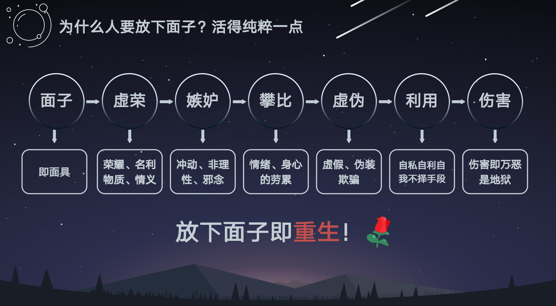 面子會(huì)滋生虛榮、嫉妒、攀比、利用和傷害,當(dāng)我們放下面子,就能實(shí)現(xiàn)自由,思想就能豐富,能連接宇宙的能量。為什么?因?yàn)槟銦o(wú)所顧忌,你心底無(wú)私天地寬了,追求自由的時(shí)候,自由也能讓我們走向幸福和美好。
