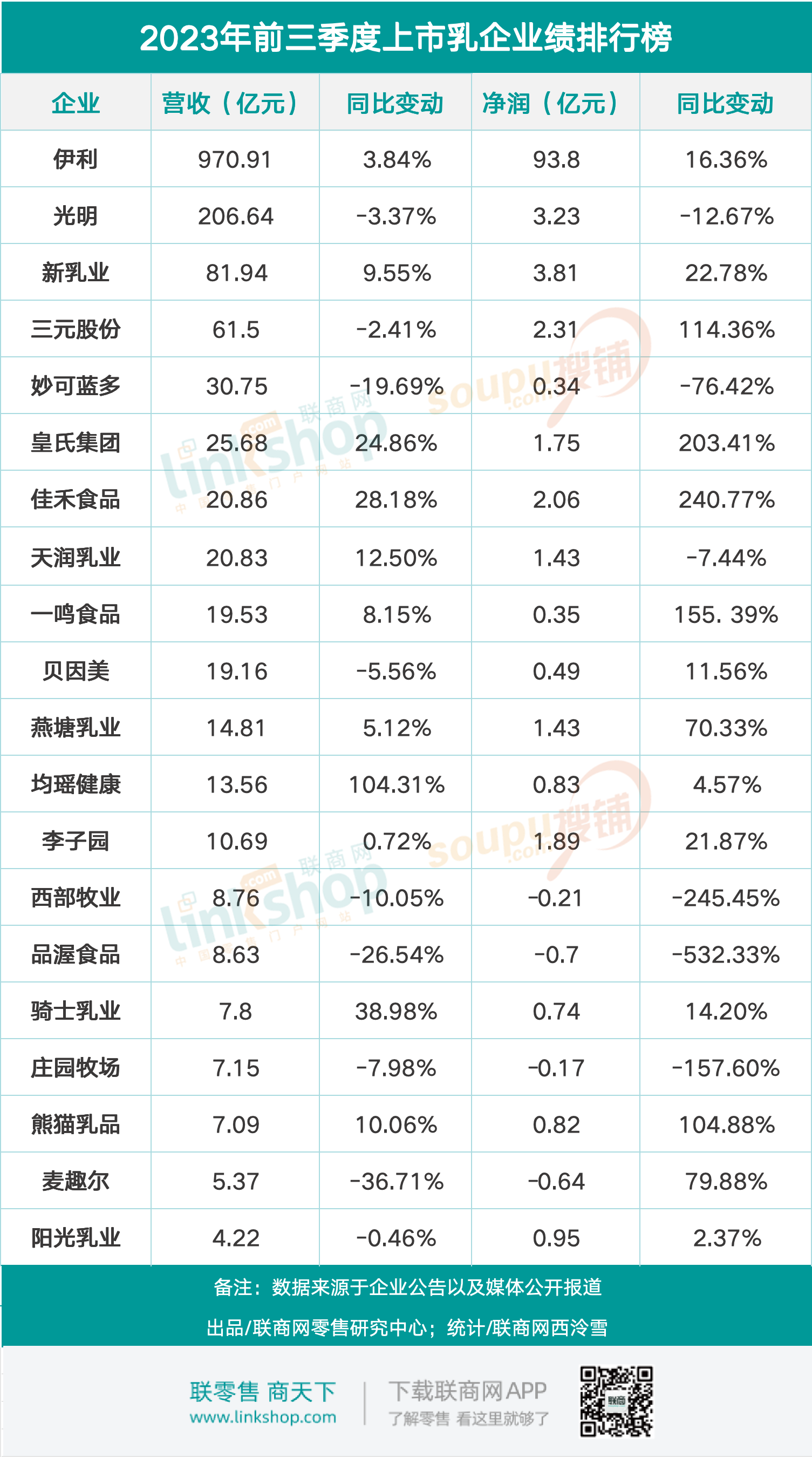 20家企業(yè)中,光明、妙可藍(lán)多、西部牧業(yè)、品渥食品、莊園牧場5家企業(yè)出現(xiàn)營收、凈利雙下滑。