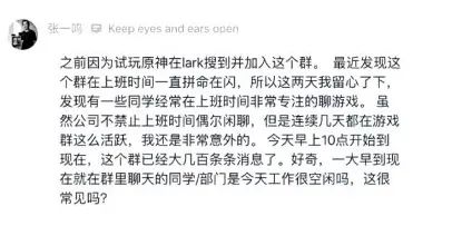 在2020年,字節(jié)跳動(dòng)創(chuàng)始人張一鳴在飛書公司內(nèi)部群上發(fā)長(zhǎng)文,斥責(zé)員工在上班時(shí)間非常專注地閑聊游戲,并質(zhì)疑一大早到現(xiàn)在這個(gè)群里聊天的同學(xué)或部門是今天工作很閑嗎,這很常見嗎?