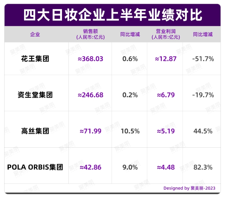 在更早一些,日妝品牌發(fā)布的半年報(bào)中可以看到,當(dāng)時(shí)花王集團(tuán)、資生堂集團(tuán)、高絲集團(tuán)、POLA ORBIS集團(tuán)在營(yíng)收上雖均呈現(xiàn)增長(zhǎng),但在相較去年同期的利潤(rùn)上,花王和資生堂已經(jīng)出現(xiàn)了下滑。