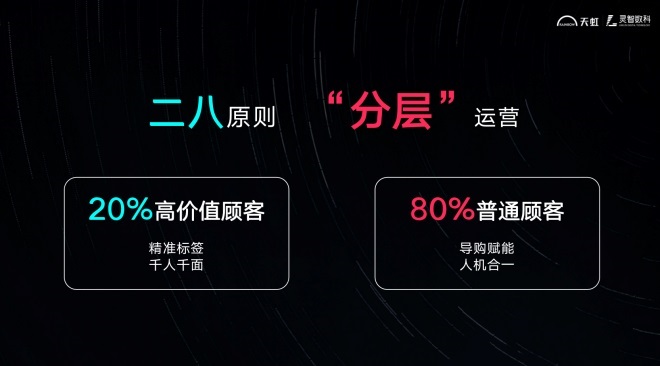 從做數(shù)字化戰(zhàn)略轉(zhuǎn)型開始,第一點(diǎn)就是不能只是從戰(zhàn)術(shù)上布局,而應(yīng)該從戰(zhàn)略層面想清楚數(shù)字化,希望做什么樣的服務(wù),給顧客怎樣的價(jià)值體驗(yàn)?從原來只是經(jīng)營一個(gè)場變成經(jīng)營顧客,我們用二八原則實(shí)現(xiàn)顧客分層運(yùn)營,針對高價(jià)值的顧客實(shí)現(xiàn)千人千面服務(wù),還有80%更多是沒有那么高價(jià)值的顧客,我們用賦能導(dǎo)購的方式,通過人機(jī)合一的方式去做好服務(wù)。