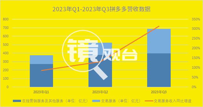 根據(jù)財報數(shù)據(jù),2022年9月多多跨境業(yè)務啟動以來,2022年Q4至2023年Q3,拼多多營收同比增速呈現(xiàn)持續(xù)抬升狀態(tài),四個季度分別為46%、58%、66%和94%。細分到交易服務收入,2023年Q1至Q3,其同比增速分別為86%、131%和315%。