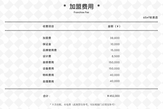 塔斯汀官網(wǎng)顯示,除去房租和水電費用之外,加盟一家65平米的門店,至少還需要45萬。其中包括3.88萬元的加盟費(終身),1萬元的品牌保證金(不開店后沒有違規(guī)行為會退還),前三年一共1.5萬的品牌使用費(第4年續(xù)簽之后一年一交,之后每年1.2萬),設(shè)計費用、裝修費用和設(shè)備費用按照店面實際情況為準。