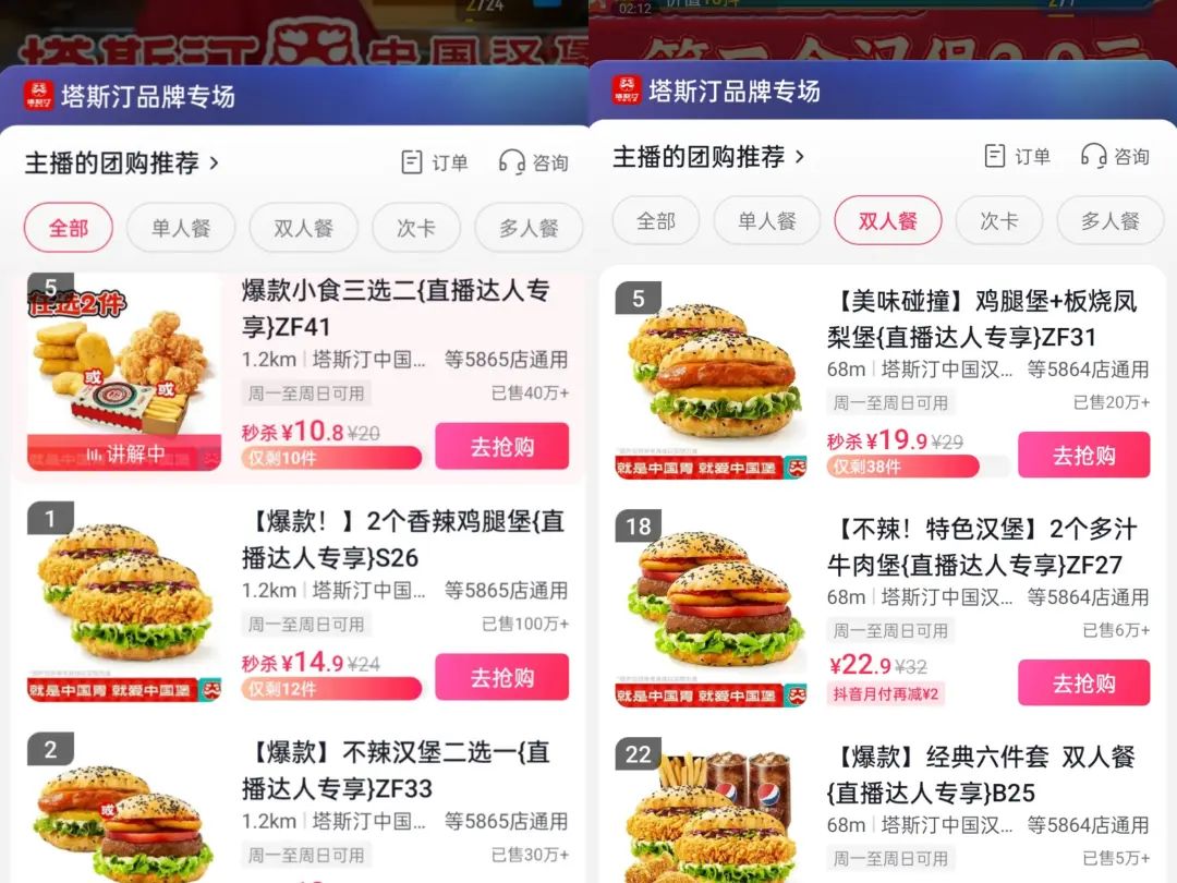 今年2月份,塔斯汀獲得抖音本地生活團購帶貨榜銷冠,抖音團購里的六種套餐,主打的34.9元的雙人餐賣出245萬單,總計超過500萬單,金額接近2億元。