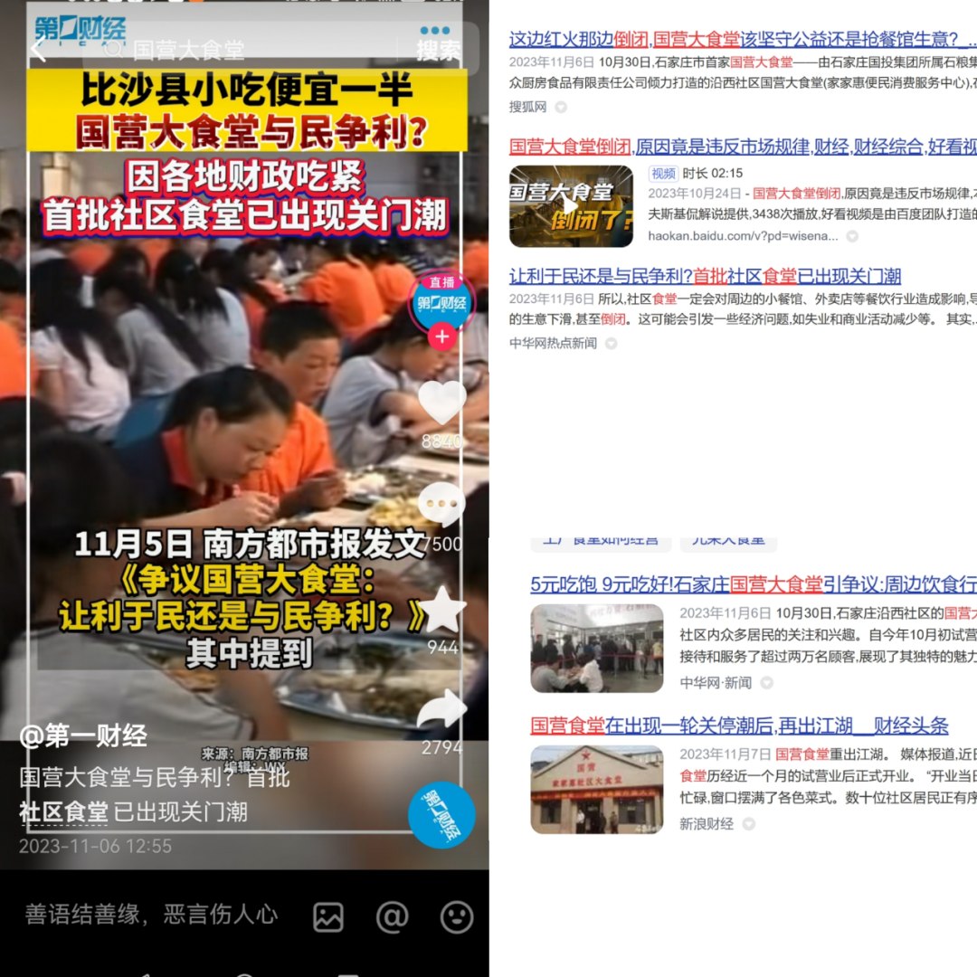 緊接著11月初,南方都市報發(fā)布了一篇名為《爭議國營大食堂:讓利于民還是與民爭利》的文章,從石家莊這家社區(qū)食堂的紅火切入,指出社區(qū)食堂仍面臨一系列問題,且首批社區(qū)食堂已經(jīng)出現(xiàn)關門潮。