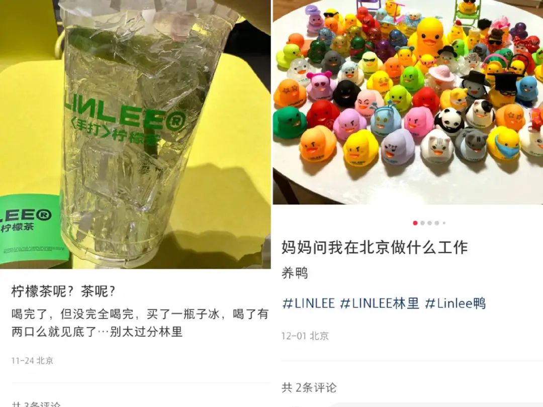 以LINLEE為例,北京地區(qū)一杯普通冰檸系列最低20元,在社交平臺上已經不止一次有網友吐槽“20多塊錢喝了四口沒了,剩下滿滿一杯冰,我這是花錢吃冰呀”,多少會覺得不值得。不過LINLEE品牌本身的出圈之處還在于他為顧客不定期推出的“各種形象的小鴨子”周邊,回歸童年的消費心理吸引著眾多消費者來打卡,買一杯檸檬茶就要一只小鴨子,有網友曾曬出自己積攢的幾十只鴨子,還表示“我媽問我在北京做什么工作?養(yǎng)鴨!