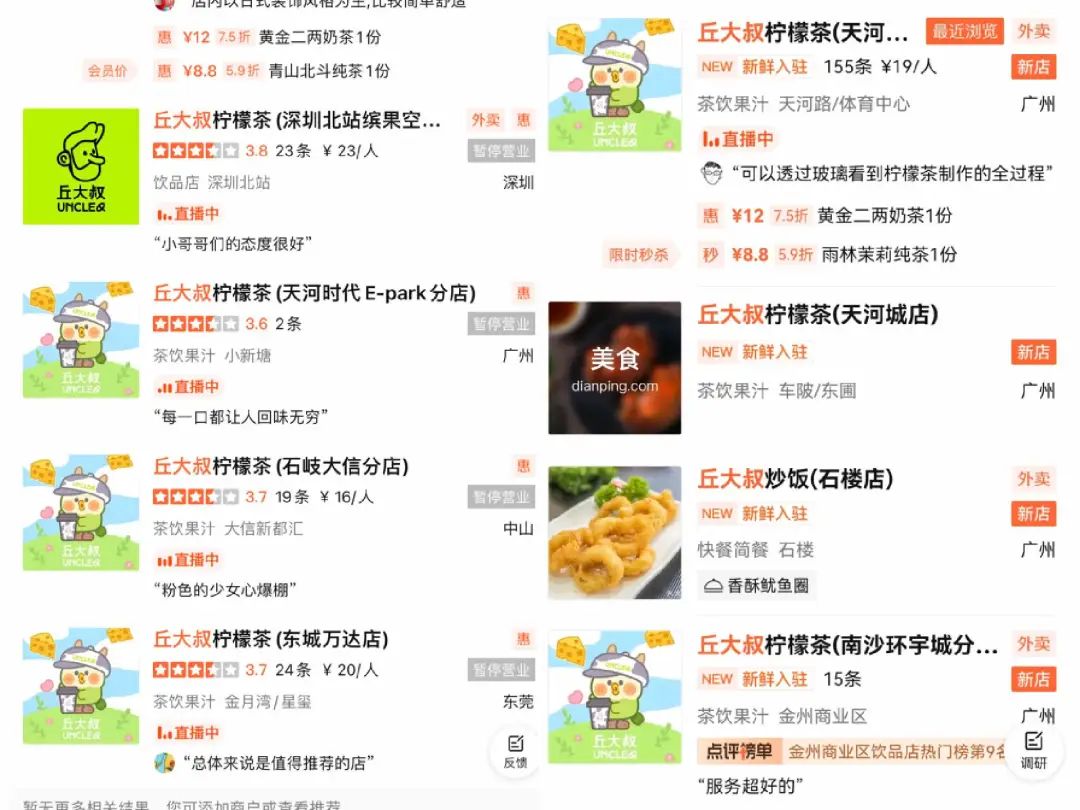 大眾點評搜索顯示,廣深市場有幾家門店確實處于暫停營業(yè)的狀態(tài),但同時也有新店在開業(yè),數據顯示丘大叔檸檬茶目前有門店大于210多家,此前品牌曾表示到2022年開出300家店的計劃。