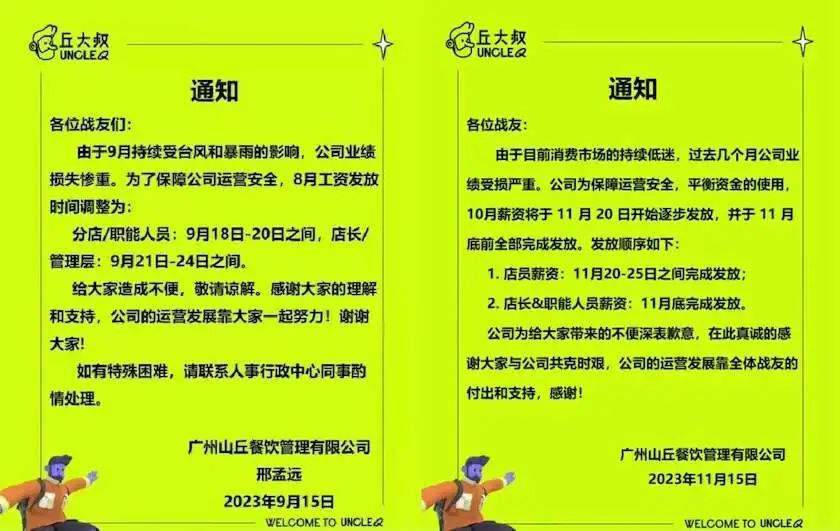 大家中說紛紜,關于欠薪事件,丘大叔官方給出回應,“對于員工薪資發(fā)放延期十多天的問題,公司深表歉意,已經積極解決,并稱,關于“發(fā)不出工資”“暴雷”等說法屬于不實消息。至于閉店,品牌方表示根據不同城市門店的經營情況做出個別門店閉店戰(zhàn)略調整屬于正常商業(yè)動作。
