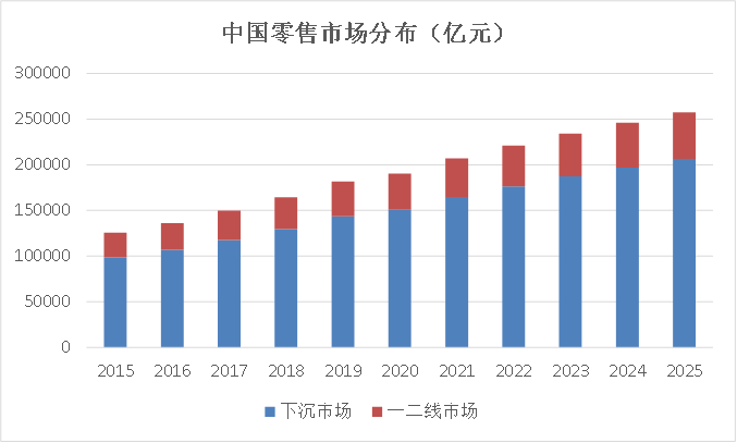 國內(nèi)零售作為一個(gè)數(shù)十萬億的大市場(chǎng),“消費(fèi)升級(jí)”歷史上關(guān)注的重點(diǎn)從來都是以一二線城市為代表的高能級(jí)市場(chǎng),但實(shí)際情況卻是,非一二線城市的下沉市場(chǎng),占到總體需求比重高達(dá)80%。