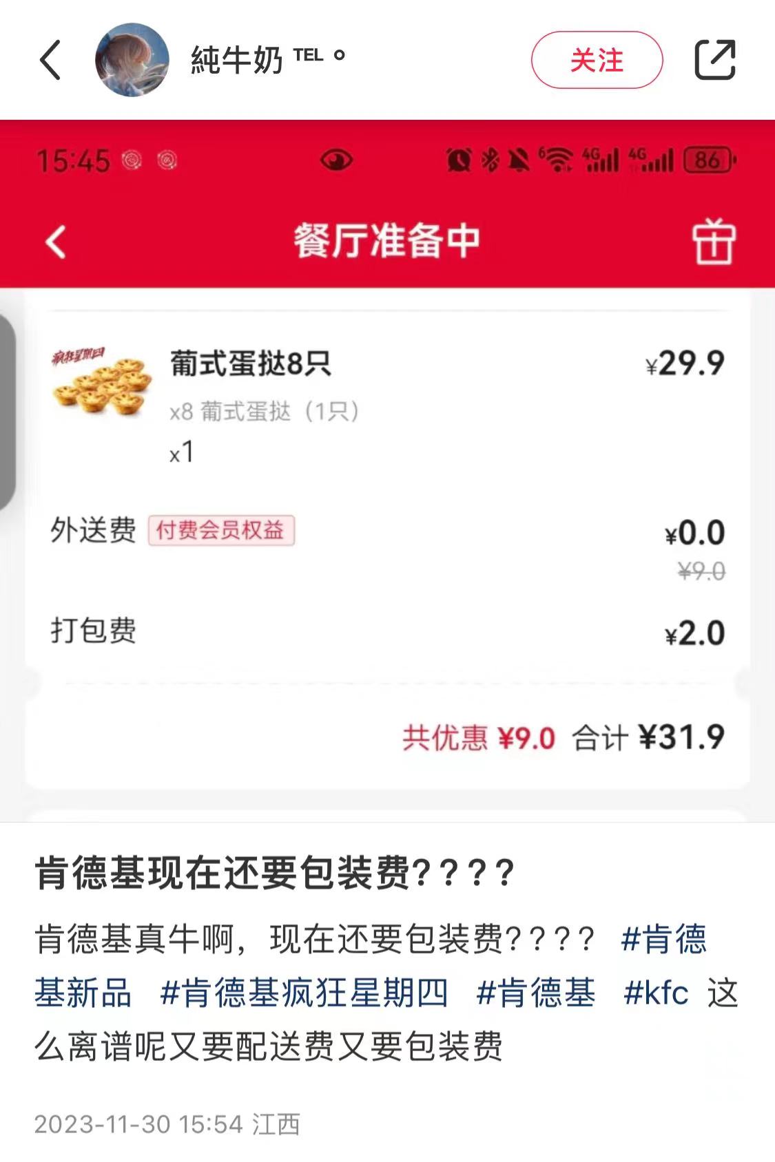 聯(lián)商快訊:近日,有網(wǎng)友發(fā)帖表示發(fā)現(xiàn)肯德基開始收取打包費。在網(wǎng)友曬出的訂單可見,頁面出現(xiàn)了“打包費”字樣,費用顯示為2元。