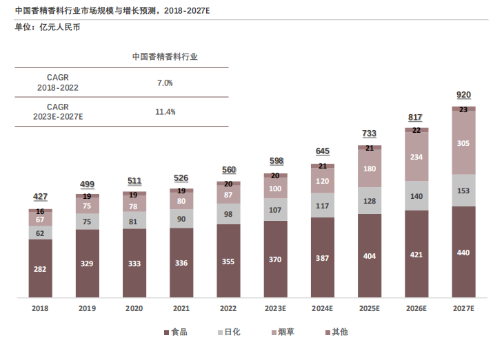 《2023年中國香精香料行業(yè)發(fā)展白皮書》中指出,中國香精香料化妝品市場規(guī)模僅從2018年的427億元規(guī)模增長到2022年的560億元,復(fù)合年增長率為7%。不過該市場未來增長潛力巨大,預(yù)計(jì)2027年將達(dá)到920億元規(guī)模,年復(fù)合增長率達(dá)11.4%。