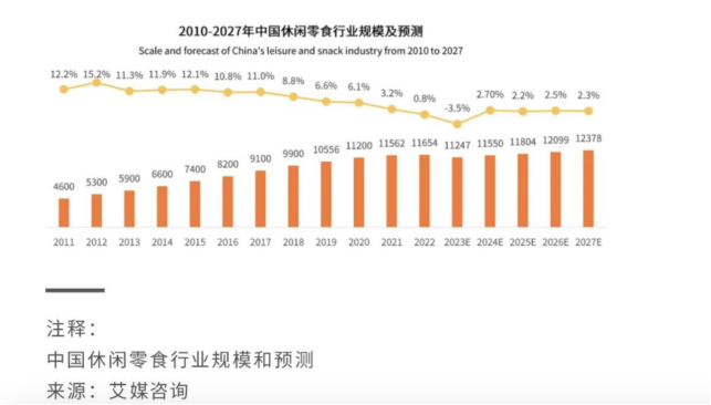 艾媒咨詢發(fā)布的《2023-2024年中國休閑食品產(chǎn)業(yè)現(xiàn)狀及消費行為數(shù)據(jù)研究報告》顯示,從2012年到2022年,中國休閑食品行業(yè)市場規(guī)模從5300億元增長至11654億元,預(yù)計2027年達到12378億元。