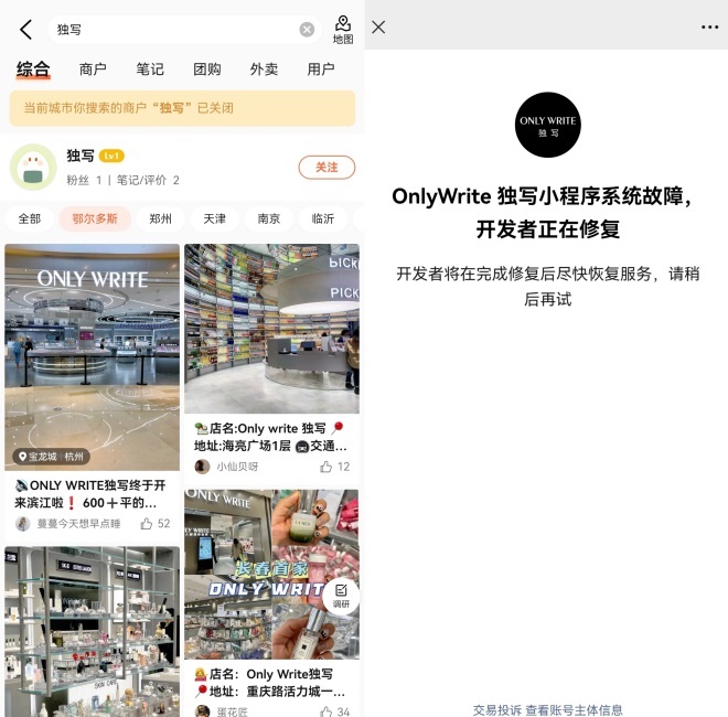 目前,Only Write獨寫微信線上商城已無法使用。《聯(lián)商網(wǎng)》通過大眾點評查詢發(fā)現(xiàn),上述僅剩的4家門店(鄂爾多斯萬的廣場店、臨沂泰盛廣場店、成都龍泉驛吾悅廣場店、菏澤佳和城店),暫時無法取得聯(lián)系或已顯示關閉。