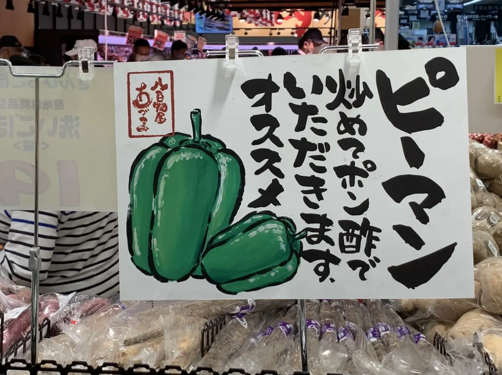 LOPIA蔬菜部門手繪的青椒招牌。圖源:號外NET 尼崎