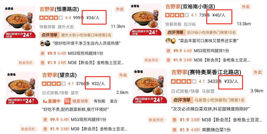 直到今天,吉野家的人均也是30元左右。這個(gè)價(jià)格在中國(guó)快餐市場(chǎng)中不能算貴,但顯然也不能算便宜。從價(jià)格上來(lái)說(shuō),吉野家相較其他快餐品牌并沒(méi)有顯著的優(yōu)勢(shì)。