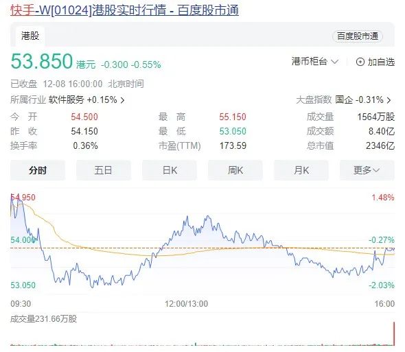 12月8日,快手科技股價(jià)下跌,截至收盤(pán),跌幅0.55%,收53.850港元/股,最新市值2158億人民幣。