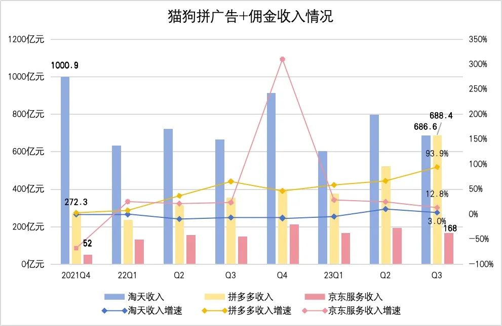 平臺(tái)廣告營(yíng)銷(xiāo)反映商家的經(jīng)營(yíng)活躍度,傭金收入則體現(xiàn)了經(jīng)營(yíng)結(jié)果。據(jù)京東2023年三季度財(cái)報(bào),在平臺(tái)屬性不斷增強(qiáng)的變革策略下,京東非商品收入主要包括廣告與傭金,第三季度收入為 168 億元,同比增長(zhǎng) 12.8%,占京東零售收入的 7.9%。京東自營(yíng)所帶來(lái)的商品收入仍占據(jù)絕對(duì)主導(dǎo)。