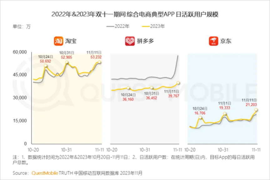 據(jù)第三方機(jī)構(gòu)Questmobile所發(fā)布的《2023年雙十一洞察報(bào)告》顯示,雙11期間,京東的日活用戶規(guī)模落后于淘寶與拼多多。貓狗拼三個(gè)平臺(tái)中,下沉用戶唯有對(duì)京東來(lái)說(shuō)是更多作為“增量市場(chǎng)”而存在,如今從用戶體量上還并未明顯帶來(lái)效果。