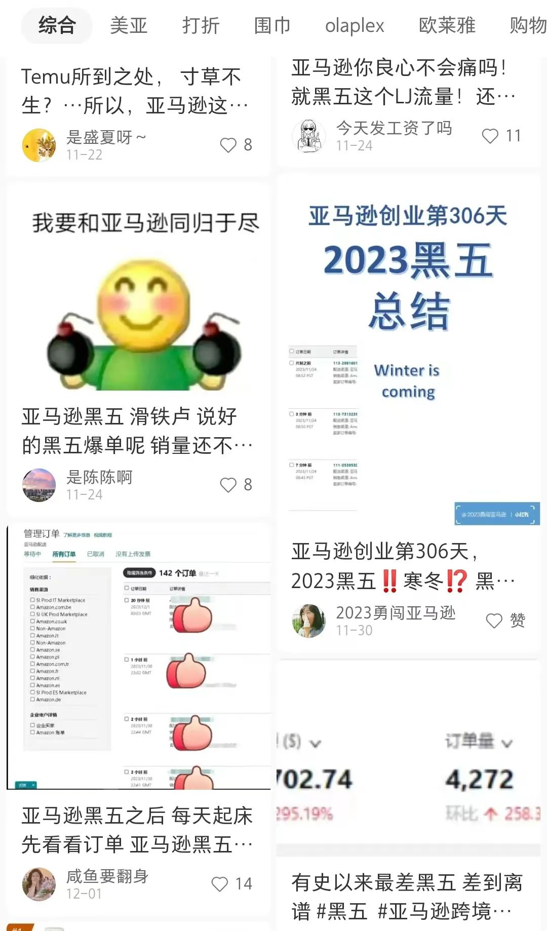 在小紅書等社交媒體上,不少亞馬遜中國(guó)賣家反饋,“今年黑五的銷量都沒(méi)有去年的一半”“一點(diǎn)都不旺,壓了很多庫(kù)存”“黑五前幾天銷量持續(xù)腰斬,比平時(shí)還差,黑五當(dāng)天更差”。
