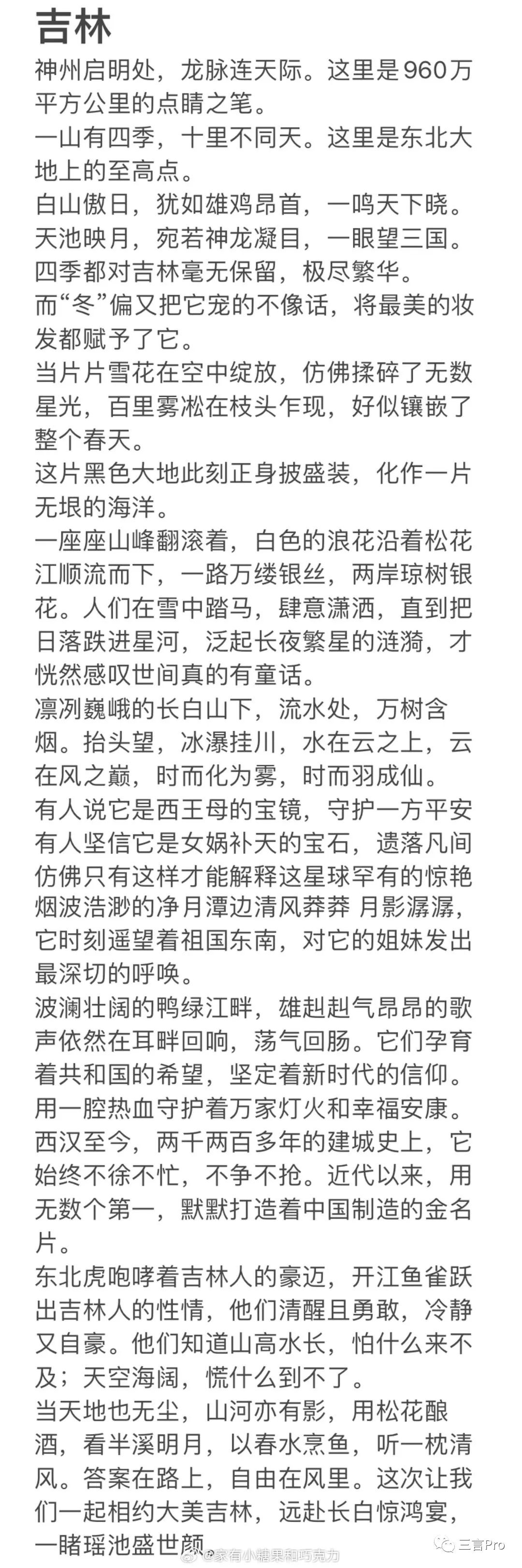 有網(wǎng)友整理了東方甄選的多個(gè)省份的文案,包括這次董宇輝念的,吉林的文案。