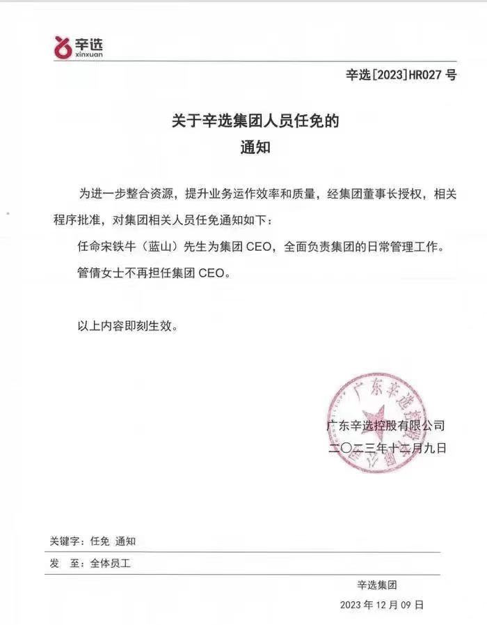 12月9日,辛選集團(tuán)發(fā)布內(nèi)部通知顯示,管倩不再擔(dān)任集團(tuán)CEO一職,并任命宋鐵牛(藍(lán)山)為集團(tuán)新CEO,全面負(fù)責(zé)集團(tuán)的日常管理工作。此舉旨在進(jìn)一步整合資源,提升業(yè)務(wù)運(yùn)作效率和質(zhì)量。