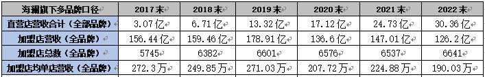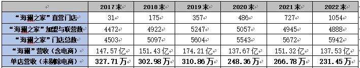 2017年度,海瀾的線下門店營收(全口徑:包括所有品牌,直營與加盟之和)是159.52億元。五年后的2022年度,海瀾的線下門店全口徑營收是156.56億元。這兩個數(shù)值看似變動不大。但在5年期間,海瀾的直營門店營收(全口徑)從3.07億元,上升到了30.36億元。加盟門店營收,從156.44億元,下降到了126.2億元。加盟店的平均單店營收從2017年的272.3萬元,下降到了2022年的190.03萬元。