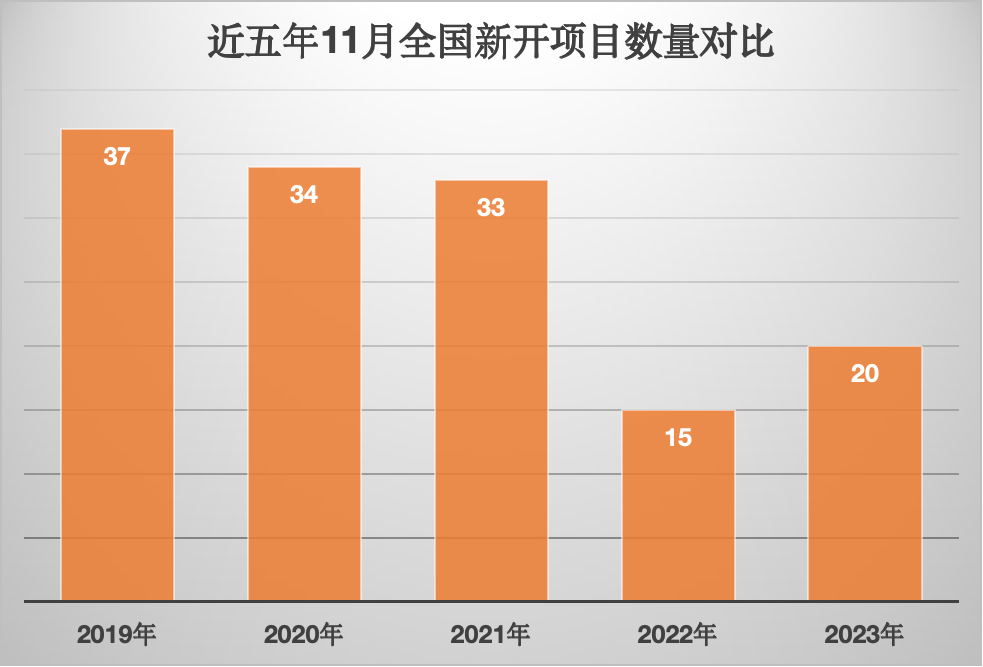 縱觀近五年數(shù)據(jù),從2019年開始,全國(guó)11月新開商業(yè)項(xiàng)目呈現(xiàn)逐年下降趨勢(shì),直至2022年11月觸底,僅新開15個(gè)商業(yè)項(xiàng)目,而今年11月又實(shí)現(xiàn)了反彈,新開商業(yè)項(xiàng)目增至20個(gè)。