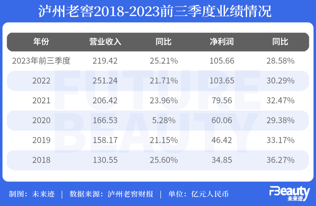 瀘州老窖近幾年的業(yè)績情況也是持續(xù)向好,除疫情爆發(fā)的2020年之外,瀘州老窖的凈利潤同比增速均超過30%。今年前三季度,瀘州老窖營業(yè)收入達(dá)219.42億元,同比增長25.21%,歸屬于上市公司股東的凈利潤達(dá)105.66億元,同比增長28.58%。