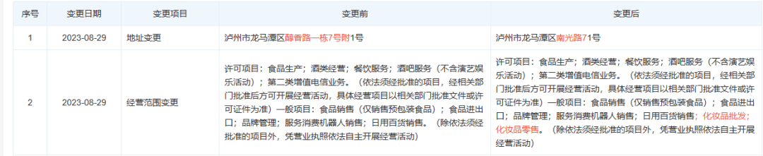 例如瀘州老窖此次推出跨界新品的運營主體是瀘州老窖新酒業(yè)有限公司,該公司是瀘州老窖銷售公司的全資子公司。天眼查顯示,今年8月29日,瀘州老窖新酒業(yè)有限公司的經(jīng)營范圍才增加了化妝品批發(fā)、化妝品零售。