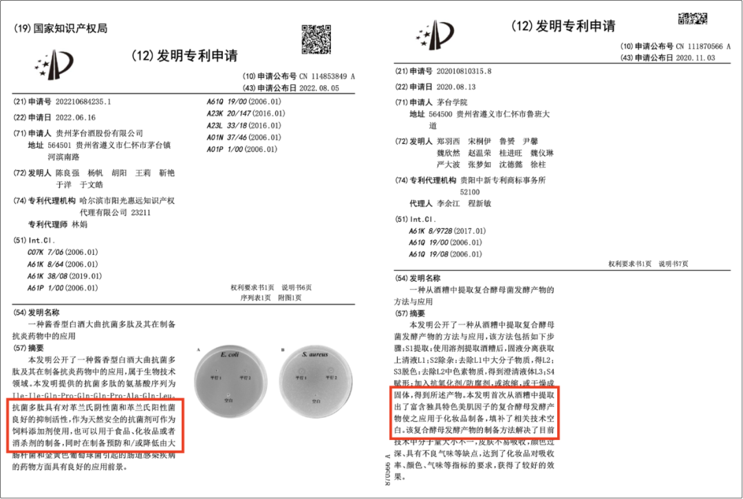 第一類是以茅臺為代表,今年8月,貴州茅臺酒股份有限公司申請的“一種醬香型白酒大曲抗菌多肽及其在制備抗炎藥物中的應(yīng)用”專利獲授權(quán)在業(yè)內(nèi)引起廣泛關(guān)注,外界猜測這是茅臺要進(jìn)軍化妝品界的預(yù)兆。