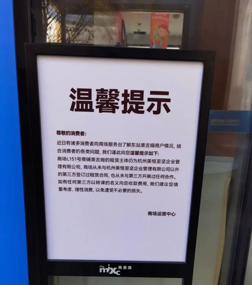 在東站萬象匯美吉姆門店上也貼著“維權(quán)微信群”。商場運營中心也發(fā)出了溫馨提示稱,美吉姆租賃主體仍然是杭州美恒至堅企業(yè)管理有限公司,商場從未與第三方簽訂過租賃合同,如有第三方以轉(zhuǎn)課名義收取費用,建議慎重考慮以免遭不必要的損失。