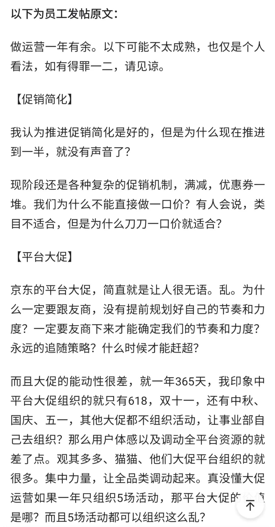 ▲圖:京東員工內(nèi)網(wǎng)發(fā)言部分截圖