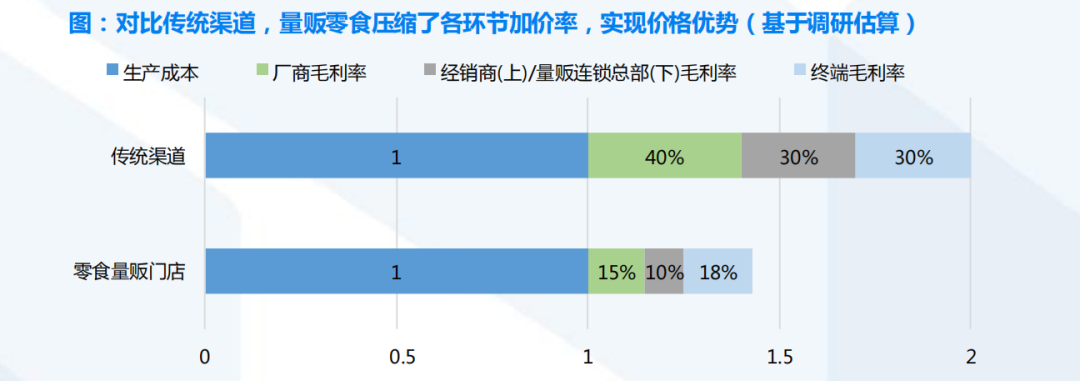 在渠道端,零食在大中型賣場(chǎng)中往往充當(dāng)著賺錢利器的角色,在本就極高的利潤(rùn)率之下再疊加所謂的陳列費(fèi)、條碼費(fèi)等渠道加價(jià),讓消費(fèi)者感到壓力山大簡(jiǎn)直再正常不過(guò)了。而量販零食品牌則直接去掉KA、經(jīng)銷商等中間環(huán)節(jié),直接對(duì)接上游零食供應(yīng)品牌,精簡(jiǎn)進(jìn)場(chǎng)費(fèi)、陳列費(fèi)等中間費(fèi)用,價(jià)格自然親民。