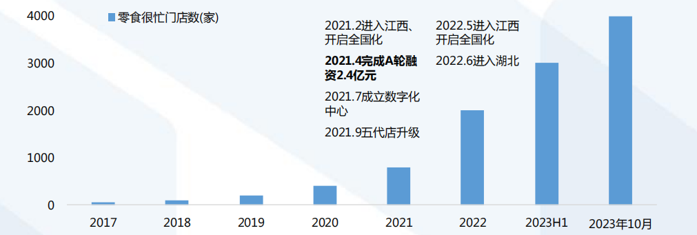 以零食很忙為例,自2017年開(kāi)出第一家加盟店后便快速拓店,并在2020年后加速崛起,截至2023年10月11日,零食很忙官宣門店數(shù)突破4000家。