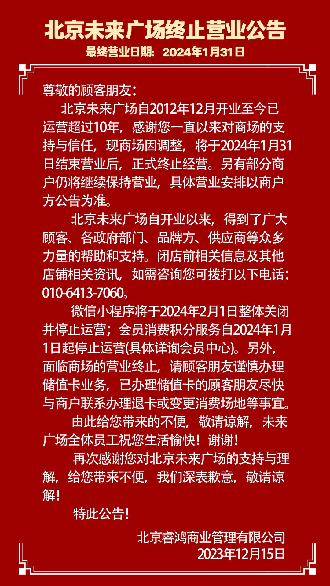 聯(lián)商快訊:12月16日,北京遠洋未來廣場發(fā)布公告,因商場調(diào)整,北京遠洋未來廣場將于2024年1月31日結(jié)束營業(yè)后,正式終止運營,另有部分商戶仍將繼續(xù)保持營業(yè),具體營業(yè)安排以商戶方公告為準(zhǔn);微信小程序也將于2024年2月1日整體關(guān)閉并停止運營,會員消費積分服務(wù)自2024年1月1日起停止運營。