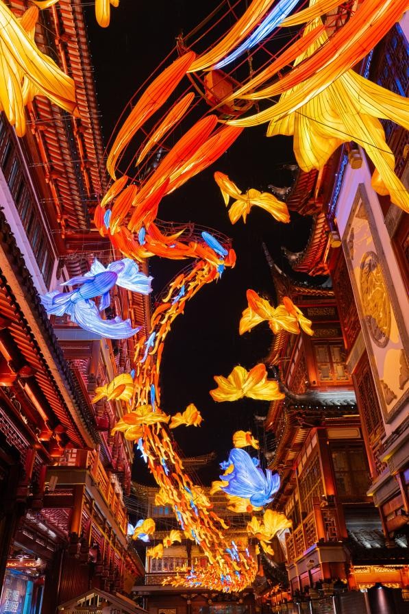 與巴黎遙相呼應(yīng),上海豫園商城凝暉路當(dāng)晚同步點(diǎn)亮了“一夜龍魚舞”的空中燈組。繽紛多彩的魚群匯聚成游龍回旋之姿,演繹了古人對“魚化龍”的想象,同時(shí)預(yù)熱了即將到來的上海豫園燈會。